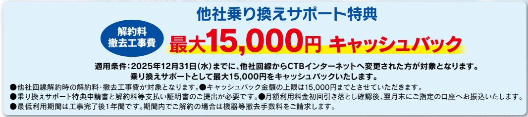他社乗り換えサポート特典 最大15,000円 キャッシュバック(解約料・撤去工事費用が対象) 適用条件:2026年3月31日(火)までに、他社回線からCTBインターネットへ変更された方が対象となります。 ※2025年12月31日までとしていましたが、2026年3月31日の受付分まで期間延長いたします。